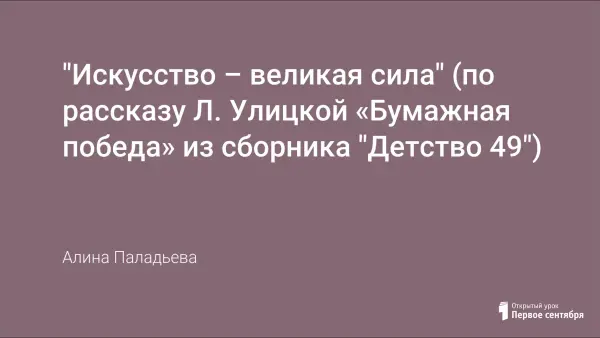 Цель урока: воспитание нравственной личности, попытка показать учащимся, как искусство помогает человеку в самых сложных ситуациях выйти победителем. Музыкальные фрагменты, фотоматериалы, сборка оригами помогают почувствовать «атмосферу» рассказа. Детальная работа с текстом готовит учащихся к сочинению-рассуждению на тему «Искусство – великая сила».