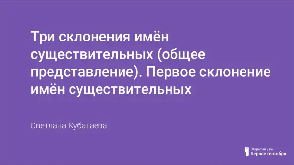 Цель урока: дать общее представление о трёх типах склонения имён существительных в единственном числе; познакомить с признаками имён существительных 1-го склонения; учить распознавать имена существительные 1-го склонения.