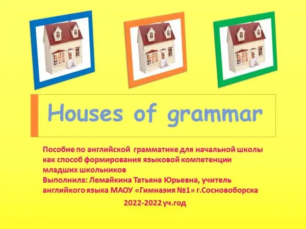 Пособие «Houses of grammar» – это 9 текстов, с помощью которых учащиеся могут вывести правила самостоятельно и 9 тестов по практической грамматике английского языка для начальной школы. Предполагается, что учащиеся знакомятся с грамматическими структурами, представленными в пособии, в течение изучения английского языка со 2-й по 4-й классы. Пособие позволяет учащимся изучить грамматические структуры Present Simple, Past Simple, Future Simple и успешно закрепить, а так же проверить свои знания.