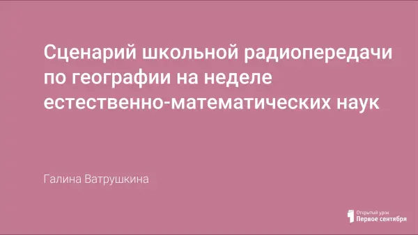 Представлен сценарий школьной радиопередачи по географии на неделе естественно-математических наук в школе. Проводится учащимися на перемене из школьной радиостанции. В передаче использована форма устного журнала.