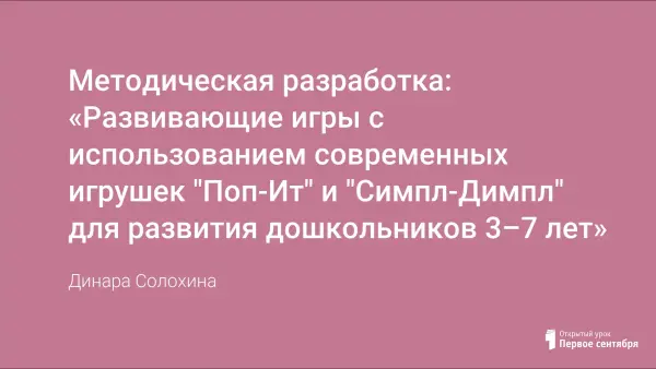 Методическая разработка на тему "Развивающие игры с использованием современных игрушек "Поп-Ит" и "Симпл-Димпл" для развития дошкольников 3–7 лет. Используя интерес детей к популярным игрушкам , мы можем заинтересовать их не скучным обучением на занятиях, а обыграть любым сюжетом или игрой. Результат опыта данной работы стала серия авторских игр для дошкольников в возрасте от 3 до 7 лет. Разработка состоит из серии дидактических игр с использованием пластин "Поп-Ит" и "Симпл-Димпл".