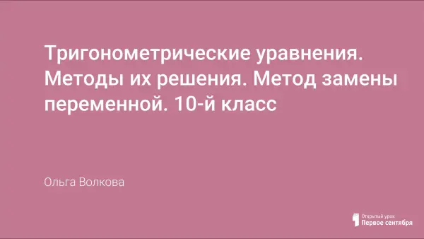 Основные цели урока: закрепить методы решения простейших тригонометрических уравнений; сформулировать один из основных методов решения тригонометрических уравнений – метод замены переменной; научить решать тригонометрические уравнения методом замены переменной; заложить основы для классификации тригонометрических уравнений, что в дальнейшем позволит ученикам по виду тригонометрического уравнения определять наиболее эффективный способ его решения.