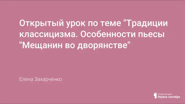 В ходе урока рассматривается пьеса Мольера «Мещанин во дворянстве» как классицистическое произведение. Раскрывается идейно-художественное своеобразие пьесы. Анализируются эпизоды пьесы, выражающие авторское понимание своей задачи как драматурга. Воспитывается критическое отношение к себе, окружающим и действительности.