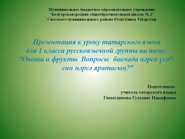 Урок татарского языка рассчитан для 1-го класса русскоязычной группы, четвертый в теме “Овощи и фрукты”. Активизирует ранее изученную лексику по теме “Овощи и фрукты”. Сингапурская методика “Куиз-куиз-трейд” – обучающая структура, в которой учащиеся проверяют и обучают друг друга по пройденному материалу, используя карточки с вопросами и ответами по теме.
