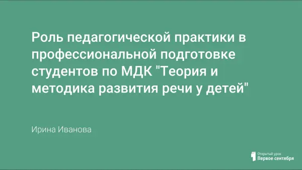В предлагаемой статье рассматриваются вопросы взаимосвязи теоретического изучения МДК 03. 02 «Теория и методика развития речи у детей» при подготовке специалистов для дошкольных образовательных учреждений с организацией педагогической практики. В процессе практики, взаимодействуя с дошкольниками, студенты получают возможность продемонстрировать свои знания, а также оценить сформированность профессиональных компетенций, необходимых для целенаправленной организации речевого развития дошкольников.