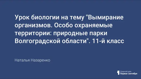 Данный электронный ресурс можно использовать при проведении урока в 11-м классе по теме «Вымирание организмов» на этапе объяснения нового материала. Наглядные средства данной презентации являются иллюстрацией основных блоков данной темы: направления эволюции живого мира, причины вымирания организмов, особо охраняемые природные территории Волгоградской области.