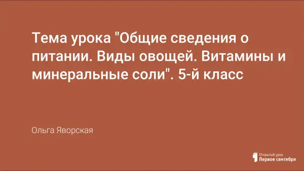 Цели урока: изучить виды овощей; сформировать понятие о процессе пищеварения, культуре питания; развивать у учащихся представление о физиологии питания; научить определять содержание витаминов и пищевых веществ в овощах по таблице; воспитывать аккуратность и внимательность в работе (приготовление блюд из овощей, соблюдение санитарно-гигиенических требований).