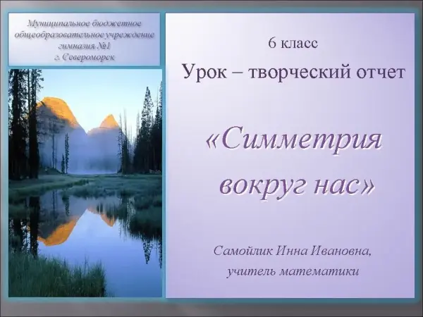 На уроке продемонстрировано множество симметричных пространственных фигур, форм, объектов, что очень важно для развития пространственного воображения. Урок проводился в форме творческого отчета. Доклады и рефераты учат умению работать самостоятельно с привлечением дополнительных источников информации. Развивают навыки исследовательской работы.