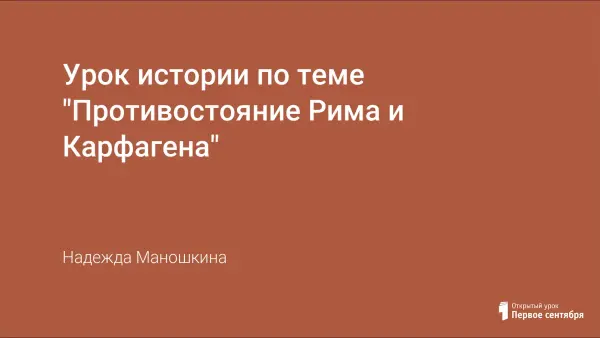 В ходе урока изучаются причины, характер войны Рима с Карфагеном. Учащиеся обобщают итоги отдельных событий и формулируют выводы; приобретают навыки работы с исторической картой.