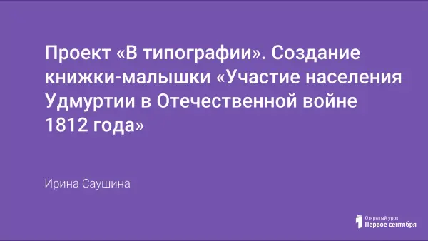 Воспитание любви к Родине - одна из главных задач истории. Изучение вопросов региональной истории по теме «Участие населения Удмуртии в Отечественной войне 1812 года» должно быть социально ориентированным, интересным, развивающим, увлекательным и запоминающимся для каждого школьника. Этого можно достичь, опираясь на развитие творческих способностей школьников, через организацию проектной деятельности на уроках.