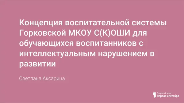 В работе представлена концепция воспитательной системы Горковской МКОУ С(К)ОШИ для обучающихся воспитанников с интеллектуальным нарушением в развитии. Работа включает в себя философскую основу концепции; научную основу концепции; нормативно-правовое обеспечение концепции и принципы концепции.