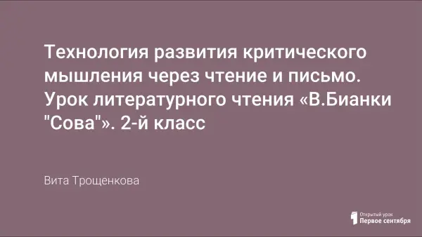 В ходе урока учащиеся познакомятся с личностью и творчеством В.Бианки; вспомнят о необходимости бережного отношения к животным; познакомятся с содержанием произведения «Сова». Урок способствует развитию критического мышления на литературном чтении, закреплению у учащихся умения прогнозировать содержание текста по его заглавию, читают вслух, постепенно переходя на чтение про себя, воспринимают на слух прочитанное.