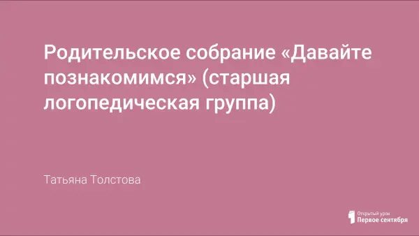 Родительское собрание проводится в начале учебного года при поступлении детей в логопедическую группу. Цель собрания: познакомить родителей со спецификой работы логопедической группы. Во время собрания родителям предлагается выполнить задания для более подробного знакомства с будущей работой. Собрание нацелено на создание тесного сотрудничества логопеда с родителями.