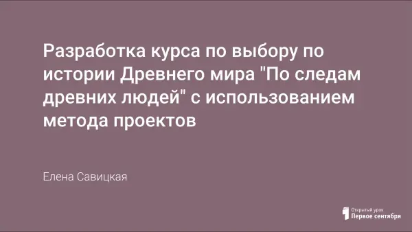 Программа курса по выбору "По следам древних людей" предназначена для учащихся 5-го класса. Цель курса является пробудить у учащихся 5-го класса интерес к истории посредством различных видов проектной деятельности. Основной задачей курса является освоить с пятиклассниками основы проектной деятельности, научиться разрабатывать различные виды проектов по истории, развивать познавательные интересы, интеллектуальные и творческие способности учащихся.