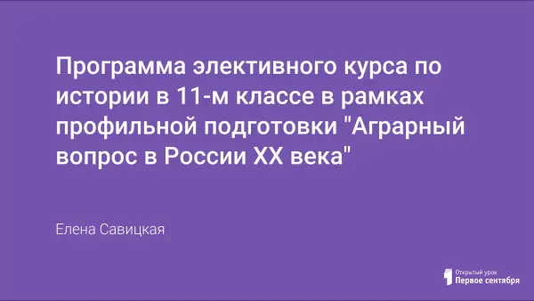 В построении учебного процесса используется схема: лекция – семинар – лабораторная работа, что позволяет рассматривать изучаемый материал с различных сторон, а также развивать навыки самостоятельной и исследовательской работы учащихся. Предполагаемые результаты: полное представление об эволюции аграрного вопроса в России XX века; систематические знания по изученной теме.