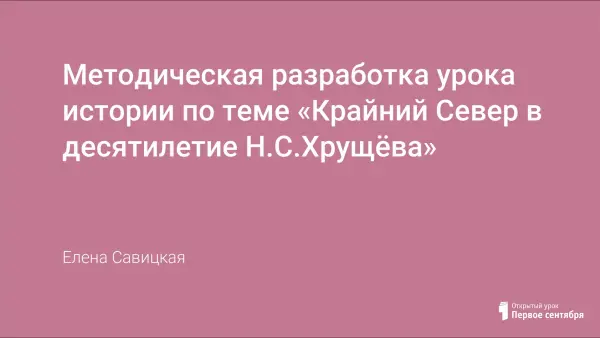 Методическая разработка урока истории по теме «Крайний Север в десятилетие Н.С.Хрущёва» включает технологическую карту и комментарий. Материал предназначен для проведения урока-экскурсии в 10-м классе (XX – начало XXI века). Цель: знакомство с историей родного края в десятилетие Н.С.Хрущёва.