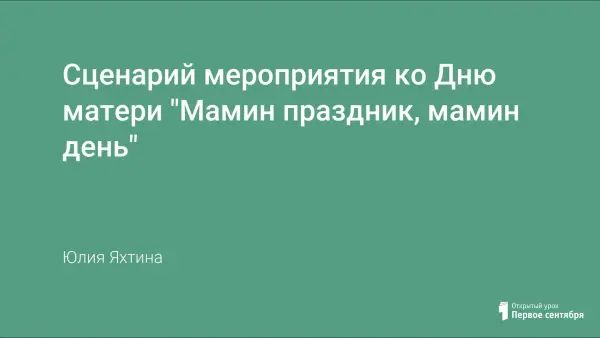 Представленный сценарий посвящен празднику "День матери", основные цели которого - воспитание уважения к женщине и умение быть заботливыми и внимательными. Каждое стихотворение содержит глубокий смысл, который заставляется задуматься над своим отношение к близким, беречь то родное, что у тебя есть. Конкурсы поднимают эмоциональный настрой.