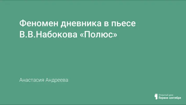 Чаще всего базовый школьный курс заканчивается драмами А.Чехова. Чтобы расширить представления учащихся о драматургии, можно использовать на уроках литературы пьесы небольшого объёма. Примером такого текста является пьеса В.В.Набокова «Полюс». Главный парадокс одноактной пьесы в стихах "Полюс" В.В.Набокова заключается в специфической сочетаемости жанра дневника и драматургической репрезентативности. Персонаж Набокова относится особым образом к своему дневнику, называя его "молитвенником". Жанровое уточнение в данном контексте актуализует перформативность молитвы и одновременно выступает как мобилизатор действенной природы драмы: молитва, чтение дневника – есть действие, событие пьесы.