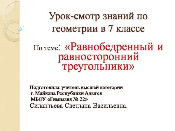 Заключительный урок проверяет знания тем «Первый признак равенства треугольников», «Равнобедренный и равносторонний треугольники», а также учит применять теоремы для решения задач по готовым чертежам.