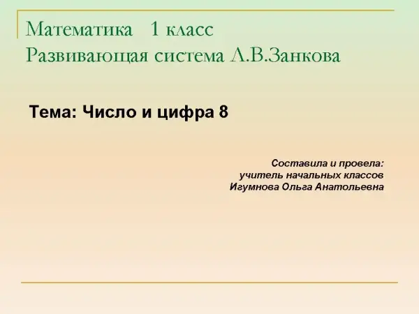 Урок знакомит учащихся с числом и цифрой «8», активизирует знания учащихся о равенствах и неравенствах и математических записях, продолжает работу, связанную с геометрическим материалом, развивает наблюдательность, внимание, воспитывает доброжелательность.