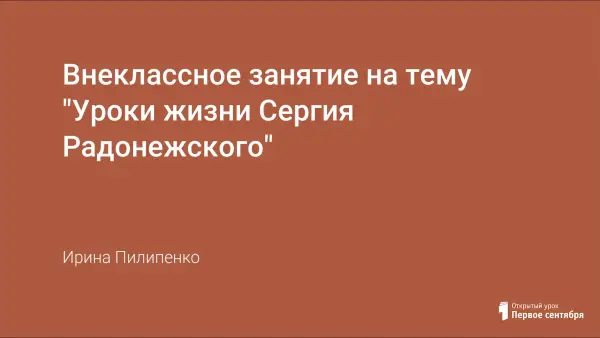 Внеклассное занятие, посвященное 700-летию со дня рождения преподобного Сергия Радонежского, применяет технологии педагогической мастерской ценностных ориентаций. Работа мастерской связана с просмотром презентации, созданной по принципу изобразительно-информационной избыточности, воздействует на эмоциональную сферу участников мастерской, создает условия для эмпатии, постижение линии жизни одного из самых любимых и почитаемых русских святых.