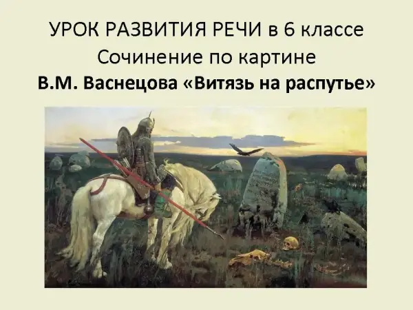 Урок развития речи по картине В.М. Васнецова «Витязь на распутье» соответствует новым ФГОС по русскому языку. Подробно расписаны цели и метапредметные результаты обучения (регулятивные, коммуникативные, познавательные, мировоззренческие). Дан лексический материал для учащихся. Кроме того, работа по картине расширяет знания учащихся по изобразительному искусству и литературе и межпредметные связи с другими уроками.