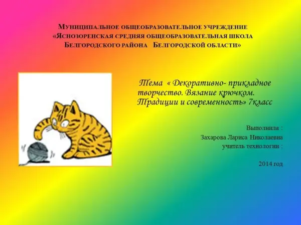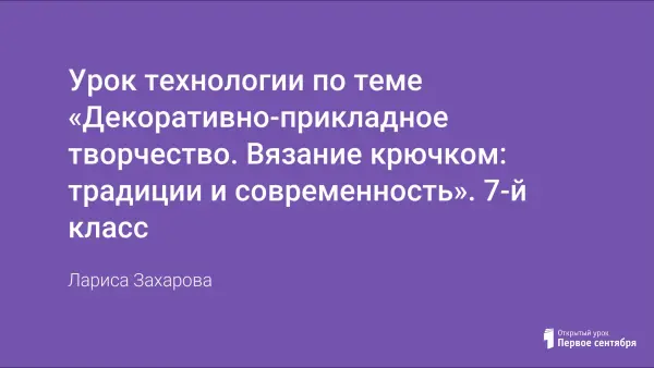 Урок знакомит учащихся с историей вязания крючком; инструментами, материалами и приспособлениями; формирует навыки организация рабочего места; учит приемам работы; прививает интерес к культуре и искусству, совершенствует вкус; развивает сенсорные и моторные навыки; учит пользоваться литературой при выполнении изделий; развивает навыки учащихся при выполнении изделий; развивает активность и самостоятельность.