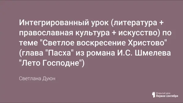 Предлагаемый урок носит интегрированный характер (литература + православная культура + искусство). Опираясь на знания православной культуры, используя текст романа И.С. Шмелева «Лето Господне» (глава «Пасха») и привлекая репродукции картин Б.М. Кустодиева, на уроке рассматривается празднование Пасхи глазами ребенка в России начала XX века. Урок проводится с ИКТ-технологиями для усиления восприятия темы урока.