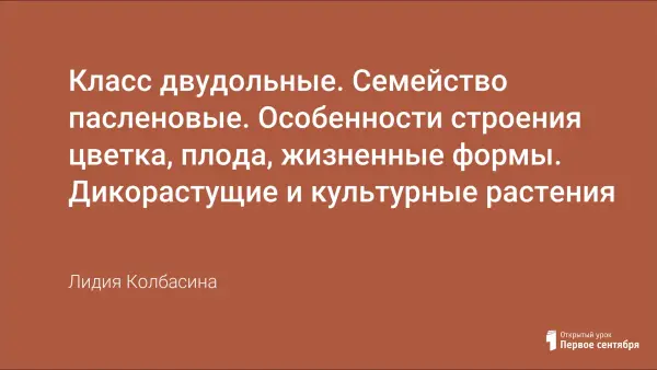 Цель урока: формирование представления о многообразии цветковых растений; изучить отличительные признаки растений семейства пасленовых; развивать умения самостоятельно работать с учебником, атласом-определителем и натуральными объектами.