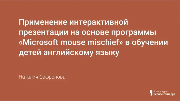 Цель работы: изучение новых форм и способов совершенствования педагогического мастерства как одного из условий повышения качества и эффективности как школьного, так и дополнительного образования. Использование интерактивной презентации на основе программы Microsoft Mouse Mischief в обучении детей школьного возраста английскому языку направлена на реализацию направлений и задач национальной образовательной инициативы «Наша новая школа».