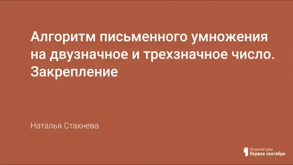 На уроке закрепляется алгоритм письменного умножения на двузначные и трехзначные числа.