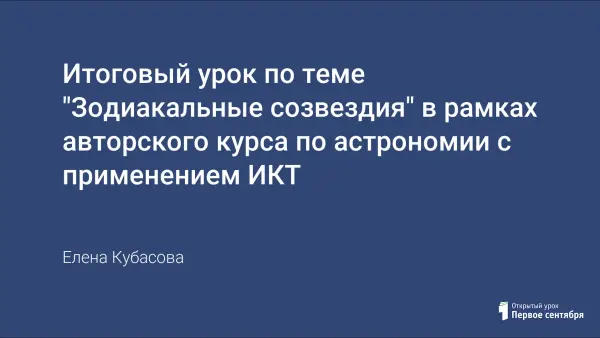 Итоговое занятие в рамках авторского курса по астрономии с применением ИКТ служит подведению итогов по теме «Зодиакальные созвездия»; отработке приёмов работы с подвижной картой, которую можно использовать при обучении начинающих астрономов любого возраста; развитию творческих способностей учащихся; воспитанию коммуникативных качеств. Разработка будет интересна педагогам средних учебных заведений, а также работающих в системе дополнительного образования.