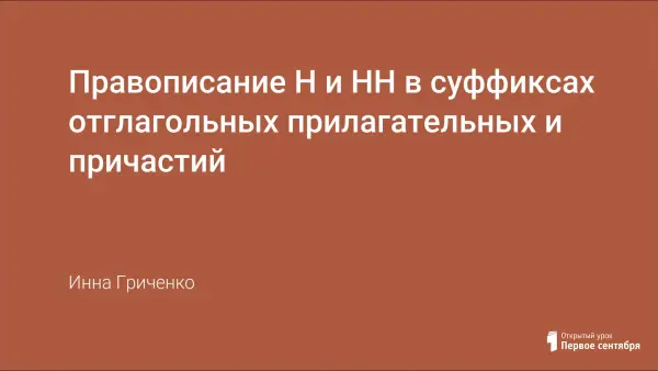 На уроке учебная деятельность организована таким образом, чтобы дети в процессе наблюдения над словами сами провели исследование и сформулировали алгоритм рассуждения, а в ходе урока научились его применять. Уделяется внимание самостоятельной работе с теоретическим материалом, самостоятельной работе при выполнении заданий, словарной работе. Цель урока – знакомство с правилом написания -н- и -нн- в суффиксах отглагольных прилагательных и причастий.