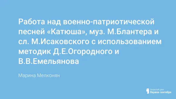 В статье автор знакомит читателя с военно-патриотической песней «Катюша», муз. М.Блантера и сл. М.Исаковского, историей ее создания. Рассказывает о применении в работе над данной песней методик Д.Е.Огородного и В.В.Емельянова. В заключение пишет о музыке как об эффективном средстве патриотического воспитания детей и молодежи в образовательных организациях.