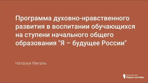 В школе должны быть созданы условия для реализации программы духовно-нравственного развития и воспитания обучающихся, обеспечивая их приобщение к ценностям семьи, своей этнической, конфессиональной, социальной группы, общечеловеческим ценностям в контексте формирования у них идентичности гражданина России и направляя образовательный процесс на воспитание ребёнка в духе любви к Родине и уважения к культурно-историческому наследию своего народа и своей страны.