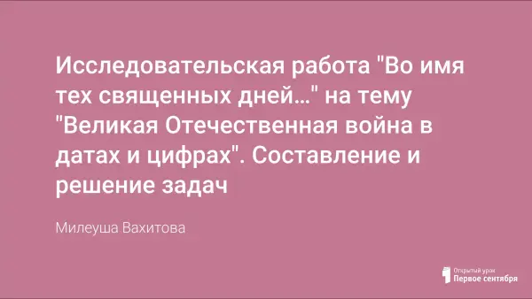 Сборник задач содержит задачи, составленные на тему Великой Отечественной войны. Посвящается 70-летию Великой Победы. Задачи сопровождаются исторической справкой и иллюстрированны фотографиями и рисунками учеников школы. Сборник можно использовать на уроках математики в 5–7-х классах и во внеклассной работе, посвящённой Великой Отечественной войне.