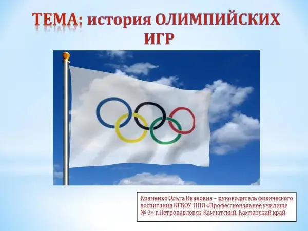 Урок-викторина может быть использован для занятий с учащимися старших классов. Участники знакомятся с историей образования древних и современных Олимпийских игр. Особое внимание уделяется достижениям спортсменов России, Советского Союза, а также организации и проведения зимних XXII Олимпийский игр в г.Сочи в 2014 г. Для закрепления материала использована форма занятия – викторина, в которой учащиеся проявляют соревновательный, спортивный интерес.