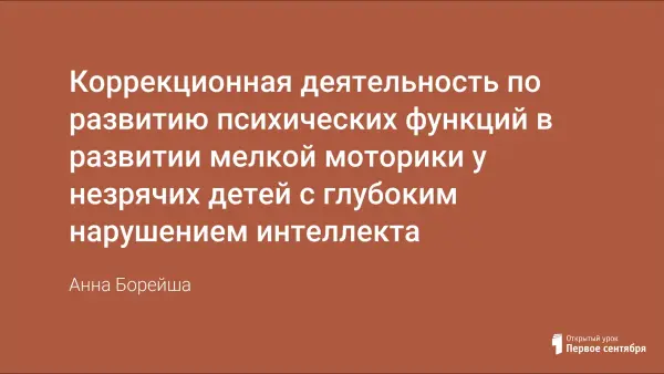Статья содержит материал для развития мелкой моторики, мышления и эмоционально-волевой сферы у детей со сложной структурой дефекта. Сложная структура дефекта представляет собой сочетание слепоты с нарушением интеллекта. Материал может быть использован для детей с легкой степенью умственной отсталости при сохранном зрении; в детских садах и для индивидуальных занятий.