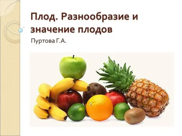 Цель урока: знакомство учащихся со строением и значением плодов и их видами; формирование представления о плоде как важном генеративном органе покрытосеменного растения; знакомство учащихся со строением плодов, их функциями и многообразием.