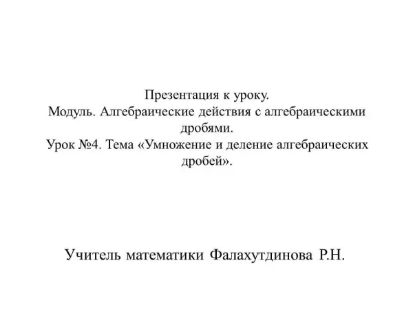 Цель урока: знакомство с правилами (формулами) умножения и деления алгебраических дробей; развитие умения выполнять действия с алгебраическими дробями; рассмотреть задания различного уровня сложности; проверить умение умножать и делить алгебраические дроби.