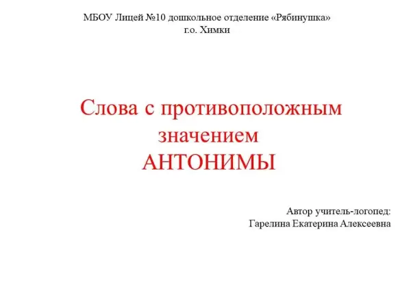 Цель занятия: расширение и уточнение объема знаний о словах с противоположным значением.