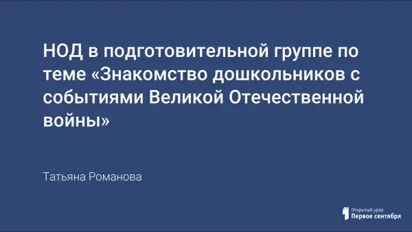 НОД предназначен для детей подготовительной и старшей группы 6–7 лет. В ходе мероприятия дети знакомятся с героическим прошлым страны, уточняют знания о событиях ВОв, закрепляют знания о мужестве воинов в годы войны, их жизнью и бытом на фронтах, знакомятся с формой и оружием воина времен ВОв.