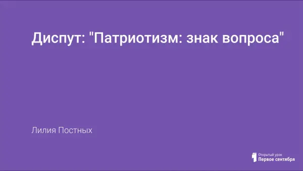 Тема патриотизма - ныне жгучая и больная тема для нашей страны, для русских людей. Как пробудить в ребёнке чувство любви к Родине? Именно "пробудить", потому что оно есть в каждой душе, и надо его усилить точным, чистым тоном. Нельзя заставить любить Отечество . Любовь надо воспитывать. Именно это явилось целью диспута "Патриотизм: знак вопроса".