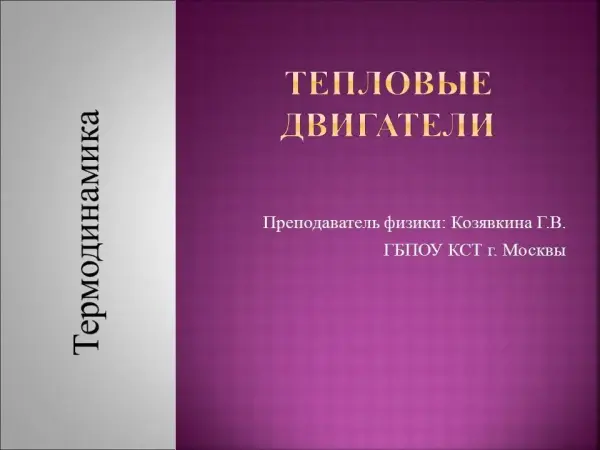 Урок изучения и закрепления знаний. С помощью эксперимента изучается принцип действия теплового двигателя, рассматривается цикл Карно, пути повышения КПД тепловых двигателей, их применение и охрана окружающей среды.