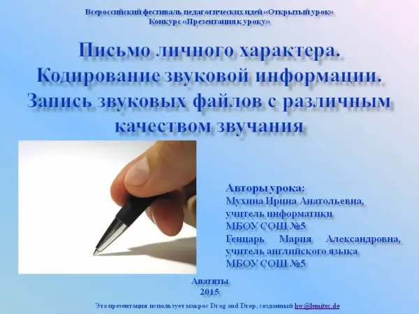 Письмо личного характера. Кодирование звуковой информации. Запись звуковых файлов с различным качеством звучания