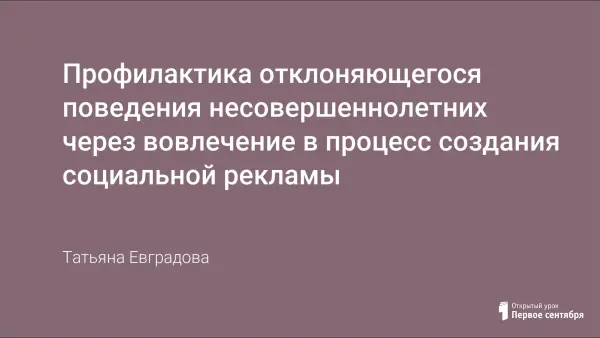 Интернет дает возможность людям осуществлять такой вид коммуникации, который ориентирован на привлечение внимания к острым, самым актуальным вопросам общества. Попытка изменить поведенческие модели людей – для этого создается социальная реклама. Цель проекта «Социальная реклама»: профилактика отклоняющегося поведения несовершеннолетних в возрасте от 14 лет через вовлечение в процесс создания социальной рекламы.
