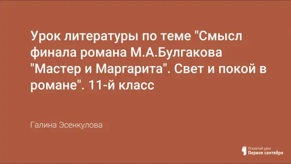 Цель урока: обучающиеся поймут, почему Мастер заслужил покой, а не свет, почему Маргарите также дарован покой; сформируют отношение к прощению, милосердию как высшей христианской ценности.
