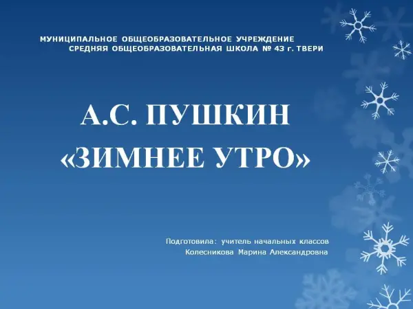 Тип урока: изучение нового материала. Учебное занятие формирует умения анализировать текст, определять средства художественной выразительности (эпитет, сравнение, звукопись, услышать, почувствовать внутренним зрением, слухом изображение зимы на картинах, музыке, фотографии). Занятие соответствует требованиям ФГОС второго поколения, основано на элементах ИКТ.