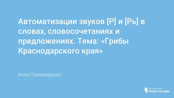 Занятие закрепляет навыки правильного произношения звуков «Р» и «Рь» в слогах, словах, предложениях, а также знакомит младших школьников с окружающим миром и активизирует словарь учащихся по теме «Грибы».