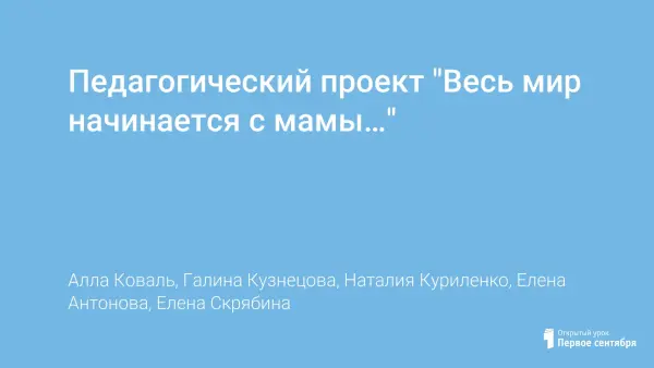 Педагогический проект предназначен для детей старшего дошкольного возраста. Проект: творческий, игровой, групповой, краткосрочный. Основные цели проекта: формирование осознанного понимания значимости мамы в жизни ребенка, а также воспитание доброжелательного уважения к матери и старшему поколению.